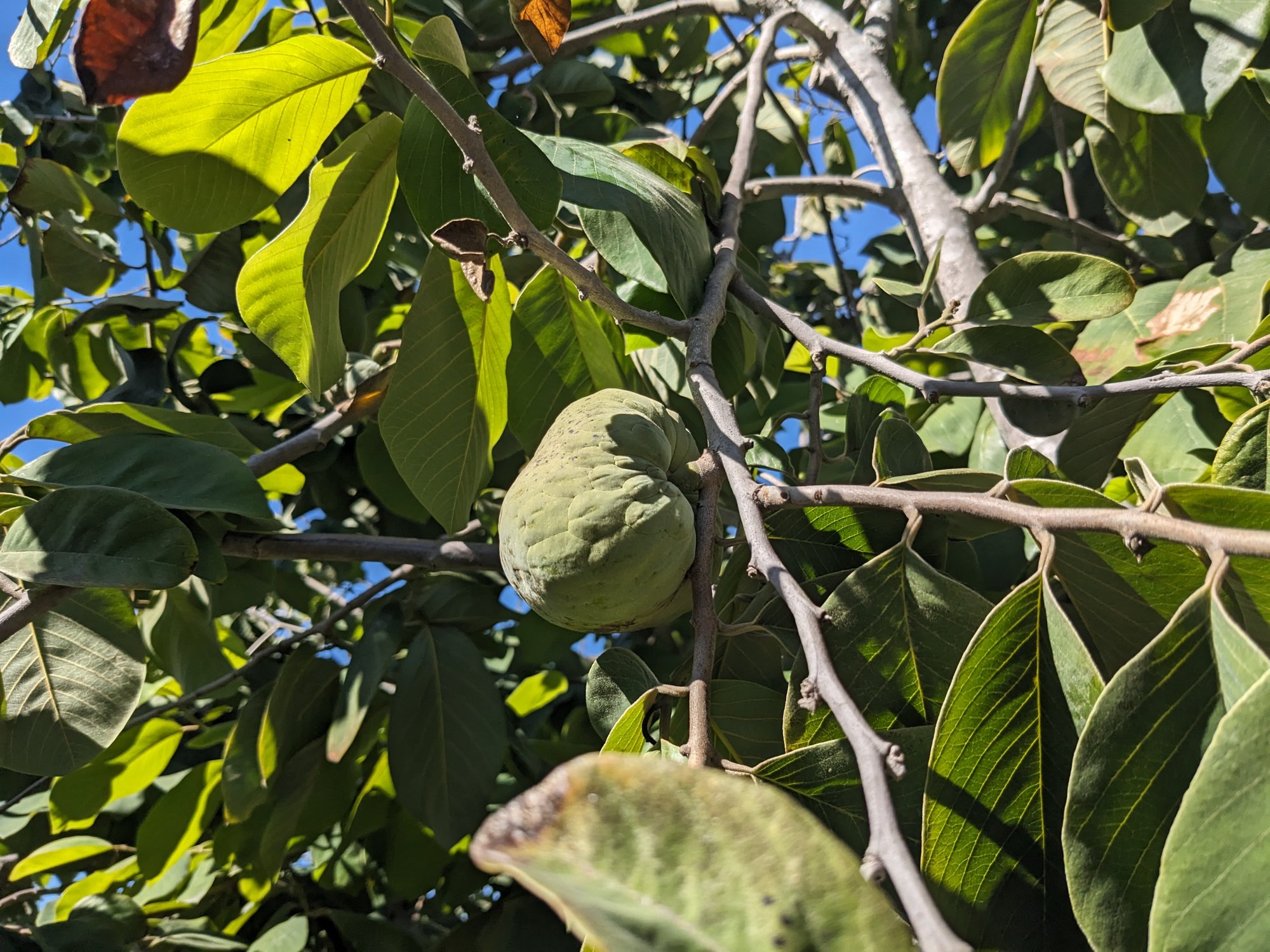 A ripening cherimoya on the tree in mid-November